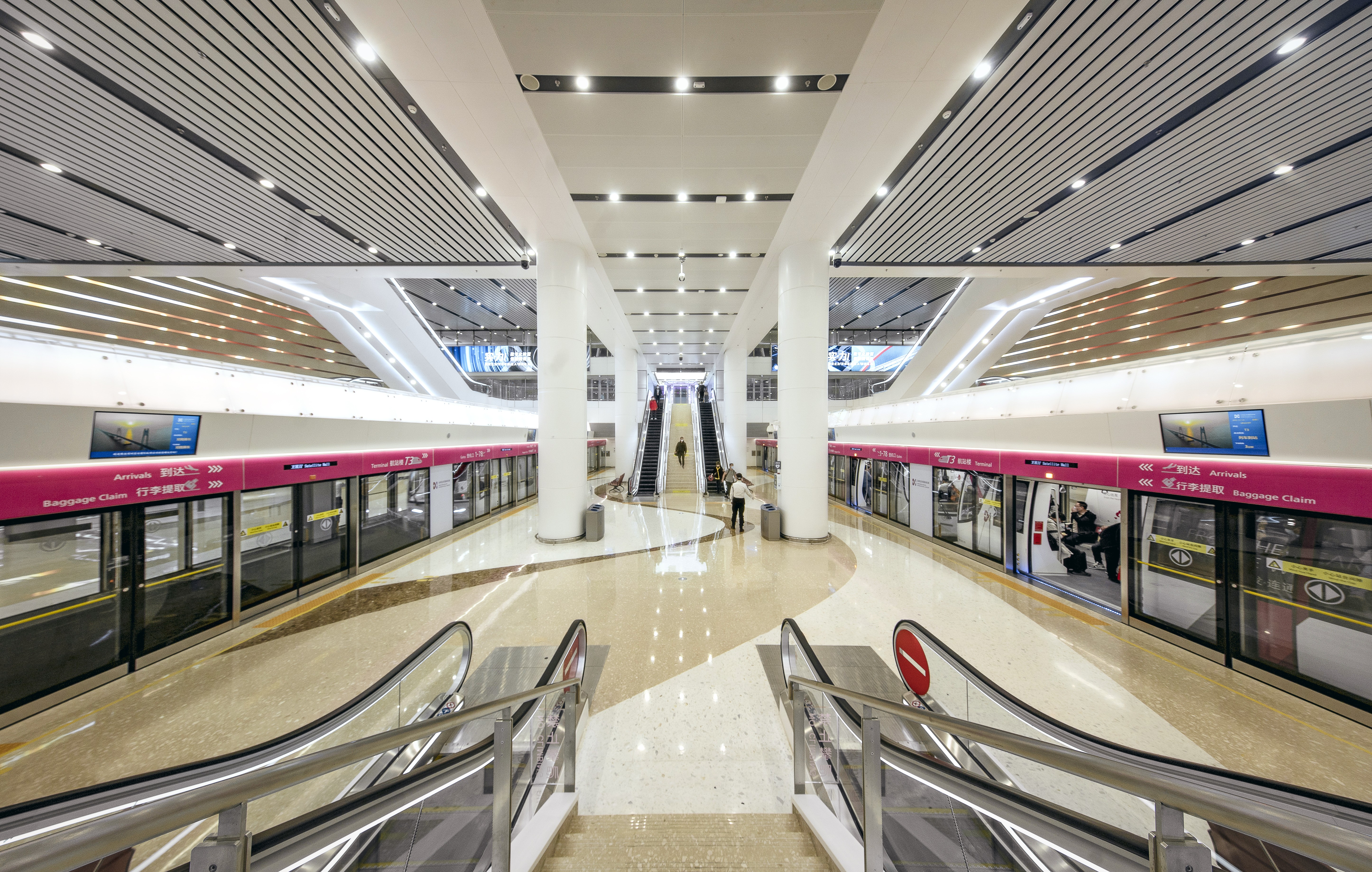 深圳寶安國際機場衛(wèi)星廳于2021年11月全面竣工,通過地下自動捷運系統(tǒng) (APM) 與現(xiàn)有航站樓無縫連接。旅客旅程從寬敞的地下APM車站開始,該車站擁有充足的凈空高度且站臺互連,一同營造出高挑明亮的環(huán)境氛圍。離開捷運站,旅客將抵達衛(wèi)星廳的中庭空間,透過出發(fā)層的天窗和周邊玻璃自然光傾瀉而下,以豐富的光影效果為旅客提供方向引導。而暖色調的天花板和景觀則營造出溫馨而人性化的室內氛圍。